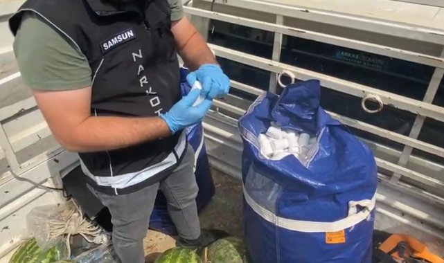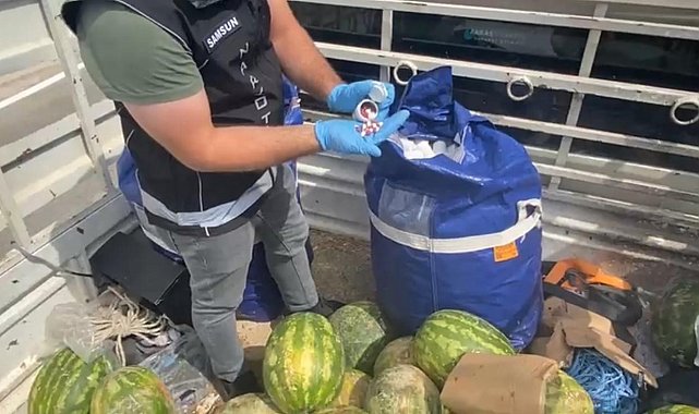 Samsun'da narkotik ekipleri, karpuz yüklü bir kamyonette gizlenmiş 110 bin 466 adet sentetik ecza hap ile uyuşturucu ticaretinden elde edildiği değerlendirilen 598 bin 770 TL nakit para ele geçirdi.