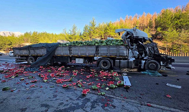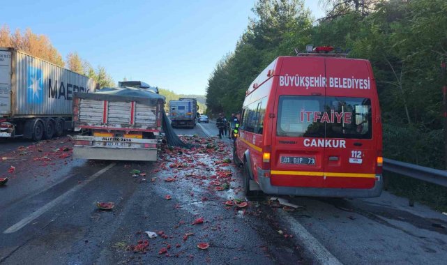 Adana-Pozantı otoyolunda karpuz yüklü tır başka bir tıra arkadan çarparak devrildi. Karpuzlar otoyola saçıldı.