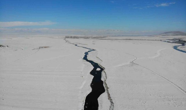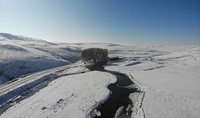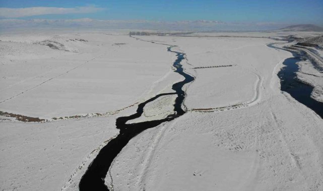 Kars'ta kış mevsimi tüm ihtişamıyla etkisini gösterirken, karla kaplı araziler arasından sessizce süzülen Kars Çayı, görenleri kendine hayran bırakıyor. Beyaz örtüyle kaplanan doğanın içinden kıvrılarak akan çay, adeta bir kartpostal görüntüsü sunuyor.