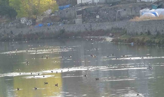 Yüzlerce yabani ördek Kars Çayı'nda yemlenirken görüntülendi.