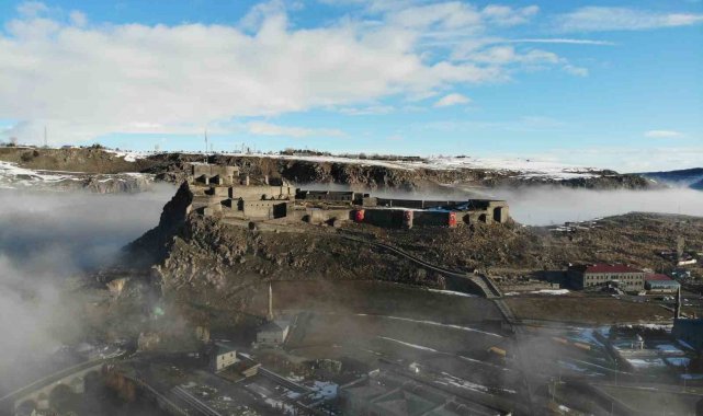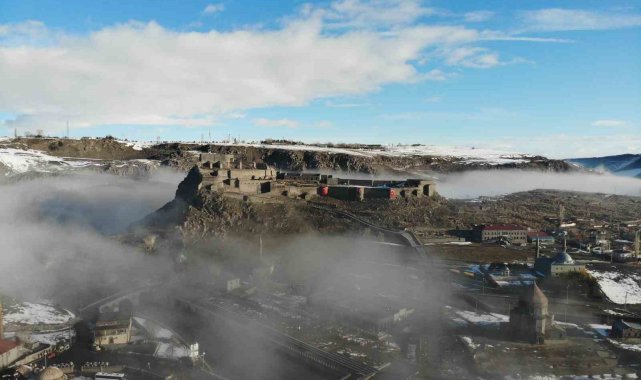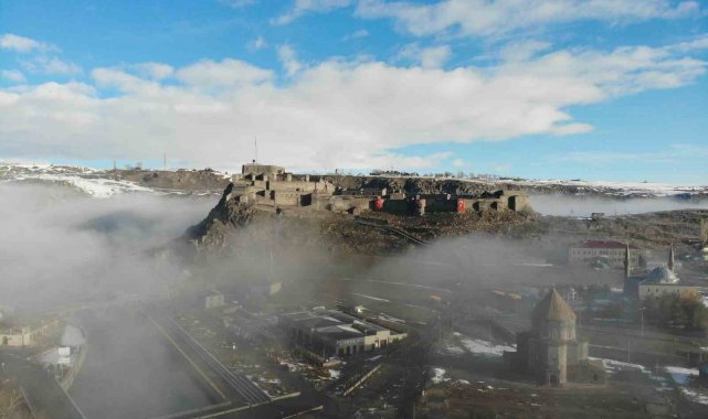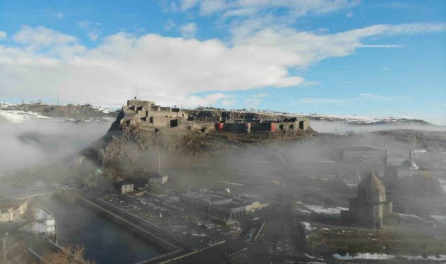 Kent merkezine hakim konumda bulunan Kars Kalesi, sis bulutlarının arasında zaman zaman görünmez hale geldi. Aynı karede yer alan tarihi kilise ve Evliya cami ise sisin arasından siluet şeklinde belirdi. Ortaya çıkan görüntüler, kentin tarihi dokusunu farklı bir atmosferle buluşturdu.