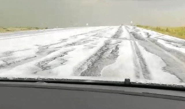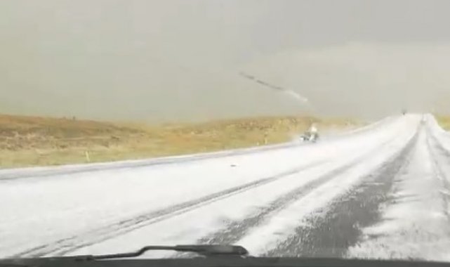 Kars'ta etkili olan dolu yağışı Kars-Selim karayolunu beyaza bürüdü. O anlar bir sürücünün cep telefonu kamerasına yansıdı.