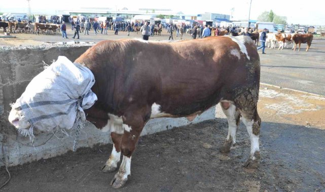 Kurban Bayramı'na sayılı günler kalırken, canlı hayvan pazarlarında hareketlilik sürüyor. Kars Hayvan Pazarı'na getirilen 900 kilo gelen 'Rıfkı' isimli boğa pazarın gözdesi oldu.