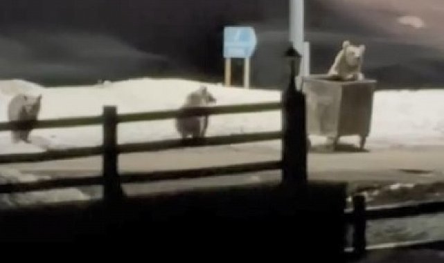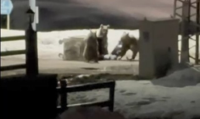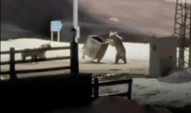 Kış uykusundan uyanan anne ayı ve yavruları, yerleşim yerine gelerek çöp konteynırlarını karıştırmaya başladı. Etrafı dikkatlice kontrol eden anne ayı çöp konteynerini çekerek devirdi. Daha sonra bir poşeti alarak uzaklaştı. O anda bölgede bulunan vatandaş ise anne ayı ve yavrularını cep telefonuyla kaydetti.