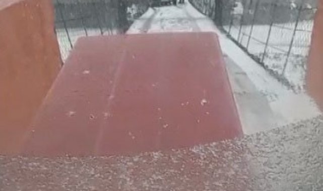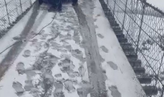 Kars'ta kar yağışı ve soğuk hava nedeniyle buz pistine dönen asma köprüde kayan bir otomobil, korku dolu anların yaşanmasına neden oldu. Metrelerce yükseklikte asılı kalan otomobil, yürekleri ağızlara getirdi.
