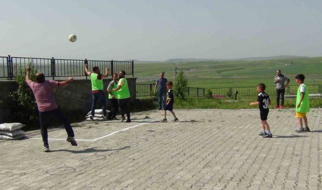 Boğazköy İlkokulu bahçesinde önce sahayı hazırlayan okul yönetimi, daha sonra öğrencilerin babalarıyla birlikte okula gelmelerini sağladı.