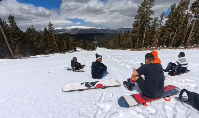Hava sıcaklıklarının artmasına rağmen 2 bin 900 rakımlı Sarıkamış Kayak Merkezi'nde kar kalınlığı yeterli seviyede korunurken, snowboard tutkunları ise baharın ortasında pistlerin tadını çıkarıyor. Kars'ın Sarıkamış ilçesinde bir araya gelen bir grup genç, sarıçam ağaçları arasında snowboardla kayarak, o anları kaydettiler.