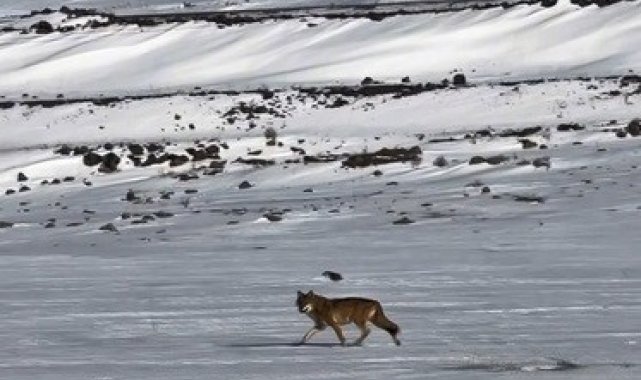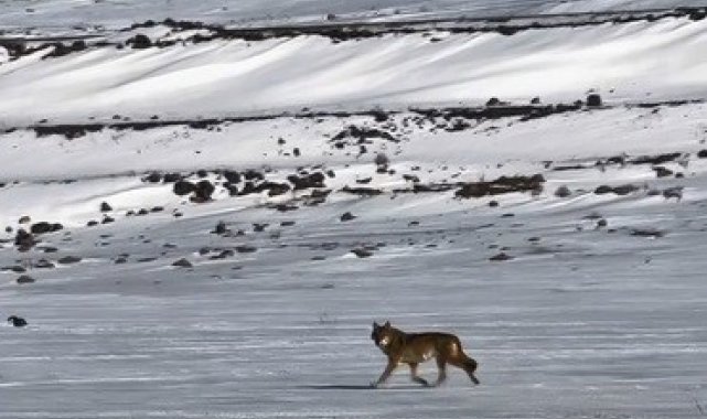 Kars-Çıldır karayolunda öğle saatlerinde meydana gelen olayda, kar yağışı ve dondurucu soğuk nedeniyle yiyecek bulmakta zorlandığı tahmin edilen bir kurt, kara yolu kenarına kadar indi.