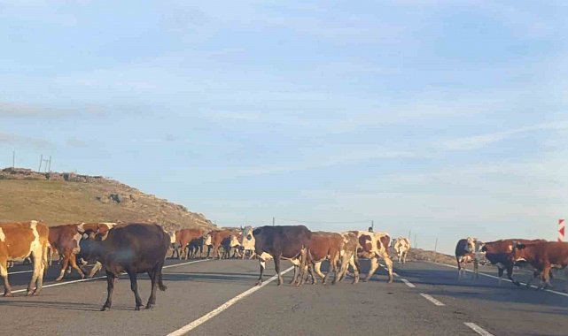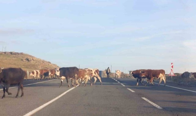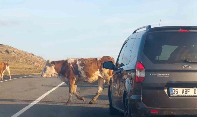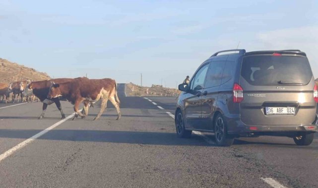 Kars'ta büyükbaş hayvanlar karayoluna çıkarak sürücülere zor anlar yaşattı.