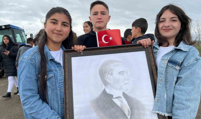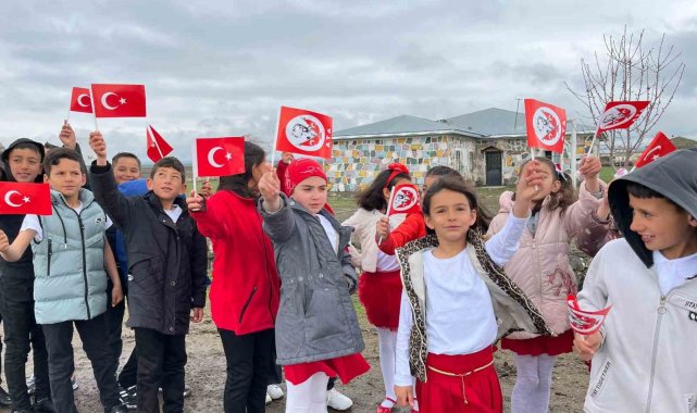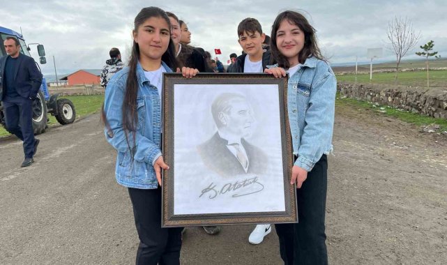 Kars'ta köy okulunda öğrenciler, Atatürk posteri, ve bayraklarla yürüyerek 23 Nisan Ulusal Egemenlik ve Çocuk Bayramı'nı kutladı.
