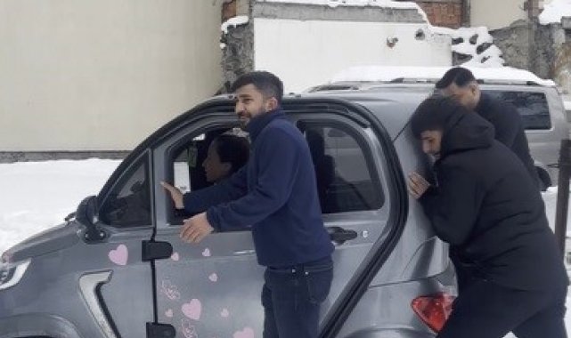 Kars'ta yoğun kar yağışının ardından ilginç ve bir o kadar da dayanışma dolu anlar yaşandı. Kent merkezinde seyir halinde olan küçük bir otomobil, karla kaplı yolda ilerlemekte zorlanınca kara saplandı. Aracı kullanan sürücü Gamze Orhan, otomobili bulunduğu yerden çıkaramayınca çevredeki vatandaşlar hemen yardıma koştu.