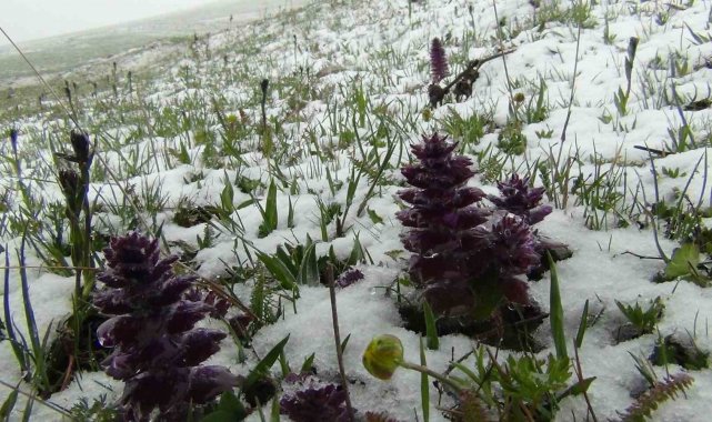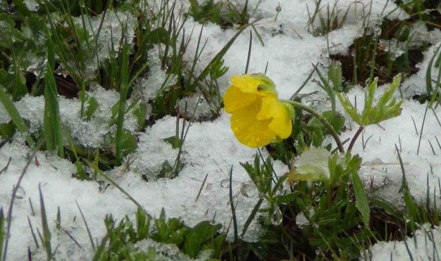 Öte yandan kar ile birlikte yeşile bürünen araziler beyaz gelinliği yeniden giyerken, rengarenk çiçekler kartpostal görüntüler ortaya çıkardı. Beyazla bütünleşen çiçekler kameralara yansıdı. Kentte hava sıcaklığı sıfırın altında 3 derece düştü. Yağışlı hava etkisini sürdürüyor.