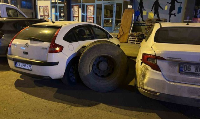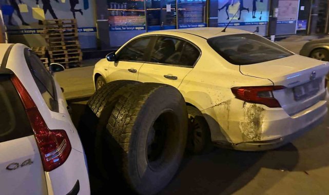 Kars'ta, seyir halindeki bir kamyonun tekeri yerinden koptu. Kopan teker, park halindeki araçlara çarptı.
