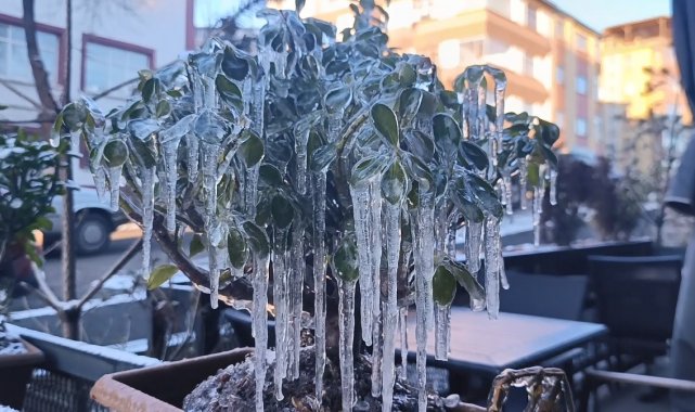 Sibirya soğuklarının etkili olduğu kentte bir iş yerinin kilidi dondu, dükken önündeki süs bitkisinde de sarkıtlar oluştu.