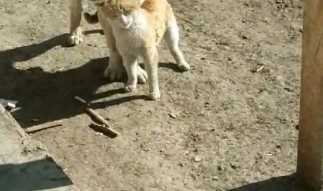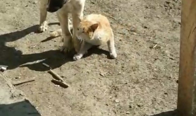 Kars'ın Akyaka ilçesine bağlı Şahnalar köyünde bir vatandaş tarafından kaydedilen görüntülerde, kedinin sevecen tavırlarla köpeğe sokularak ona güvenle yaslandığı ve oyun oynadığı anlar yer alıyor.