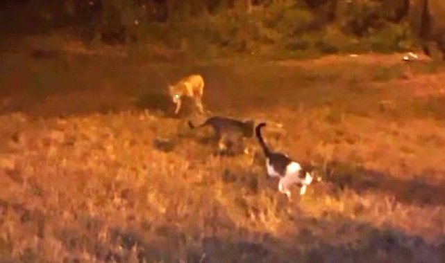 Kars'ta tilkiyle kedilerin oyunu cep telefonu kamerasına yansıdı.