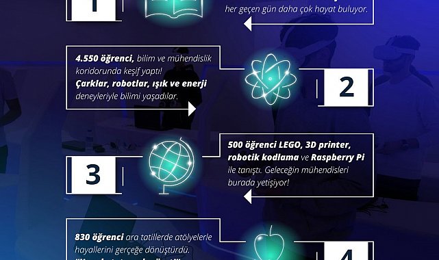 Kartal'da 2024-2025 eğitim ve öğretim döneminde 11 bin 938 kişi, Makina Hangar'da düzenlenen atölye, etkinlik ve şenliklere katıldı. Çocuklar ve gençler, hem bilimsel deneylerle hem de teknoloji tabanlı projelerle geleceğin dünyasına hazırlık yapma fırsatı buldu. Merkezde düzenlenen bilim ve mühendislik koridorunda 4 bin 550 öğrenci çarklar, robotlar, ışık ve enerji deneyleriyle bilimin heyecanını yaşadı. 500 öğrenci LEGO, 3D printer, robotik kodlama ve Raspberry Pi gibi uygulamalarla tanışarak kendi projelerini geliştirdi. Ara tatillerde açılan atölyelerde ise 830 öğrenci, "Hayal et, tasarla, üret" mottosuyla hayallerini gerçeğe dönüştürdü. Yaz tatili boyunca gerçekleştirilen bilim kampına katılan 248 öğrenci, LEGO'dan Raspberry Pi'ye uzanan yenilikçi çalışmalarla teknoloji dolu bir serüvene adım attı. Ayrıca 240 kişi VR gözlüklerle sanal dünyayı deneyimledi, geleceğin teknolojilerine ilk adımlarını attı.