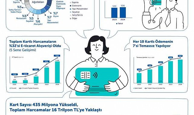 'Türkiye'de Kartlı Ödemeler 2024' araştırması, yıl sonu itibarıyla ülkemizde toplam banka ve kredi kartı sayısı, 2023'e göre yüzde 12.5'lik artışla 435 milyon adede (129 milyon kredi kartı - 306 milyon banka kartı) yükseldi. Banka ve kredi kartlarıyla yapılan toplam harcamalar da yüzde 92.3'lük artışla 15 trilyon 845 milyon TL'ye ulaşırken, bu harcamaların 13 trilyon 310 milyon TL'lik kısmı kredi kartlarıyla gerçekleşti.