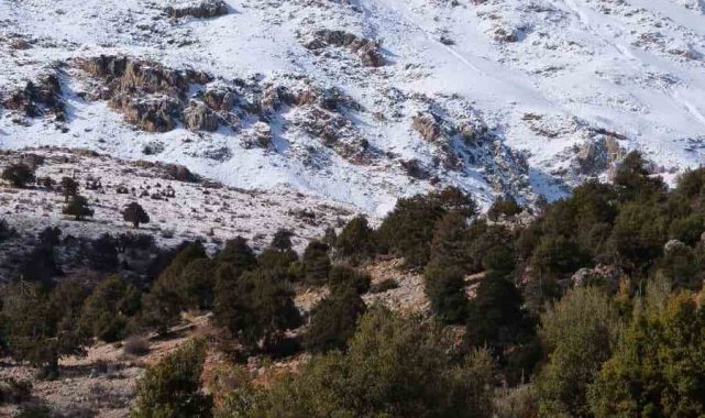 Antalya'nın Kaş ilçesinde soğuk havanın etkili olduğu yüksek rakımlı bölgeler kar yağışıyla birlikte beyaza büründü.