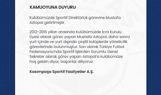 Lacivert-beyazlı kulüpten konuya ilişkin yapılan açıklamada, "Kulübümüzde Sportif Direktörlük görevine Mustafa Aztopal getirilmiştir. 2012-2015 yılları arasında Kulübümüzde İcra Kurulu Üyesi olarak görev yapan Mustafa Aztopal, daha sonra yurt içinde ve yurt dışında çeşitli kulüplerde yöneticilik görevlerinde bulunmuştur. Son olarak Türkiye Futbol Federasyonu'nda Sportif İşlerden Sorumlu Genel Sekreter olarak görev yapan Aztopal'a kulübümüze hoş geldin diyor, başarılar diliyoruz" denildi.