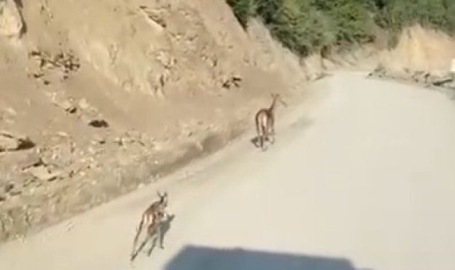 Kastamonu'nun Araç ilçesinde aracıyla seyir halinde olan bir vatandaş, önüne çıkan anne ceylan ile yavrusunu görüntüledi. Cep telefonu kamerasına yansıyan görüntülerde, yavru ceylanın ayağının kırık olduğu ve bu şekilde yürümeye çalıştığı kaydedildi.