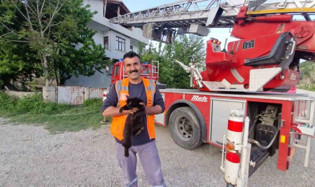 Kastamonu'nun Hanönü ilçesinde çıktığı çatıda mahsur kalan kediyi itfaiye ekipleri kurtardı.