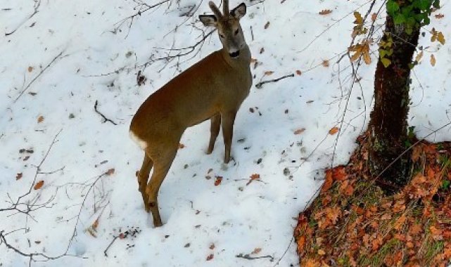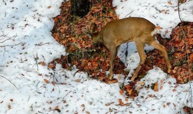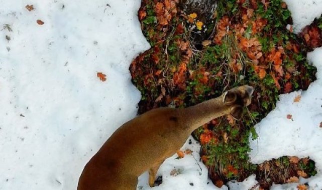 Kar yağışı sonrasında doğadaki manzarayı görüntülemek isteyen Kubilay Onurcan Çalık, ormanlık alanda çekim yaptığı sırada yiyecek arayan iki karacayı fark etti. Karla kaplanan arazide sessizce ilerleyen karacalar, hem yiyecek aradı hem de buldukları yiyecekleri tüketirken dron ile görüntülendi.