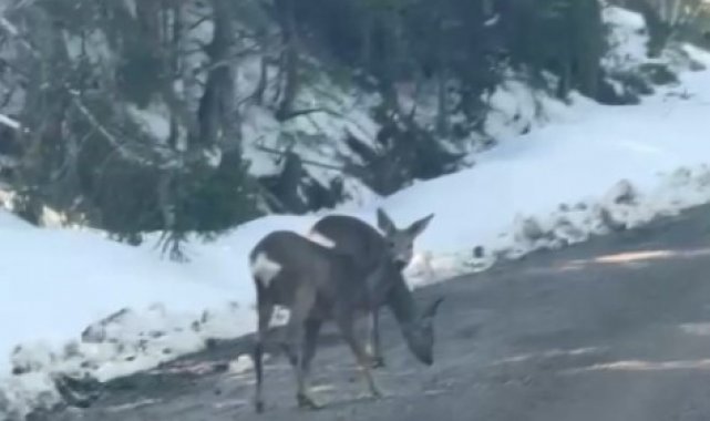 Kastamonu'nun Daday ilçesinde yoldaki çukurdan su içen karacalar, su içerken görüntülendi.