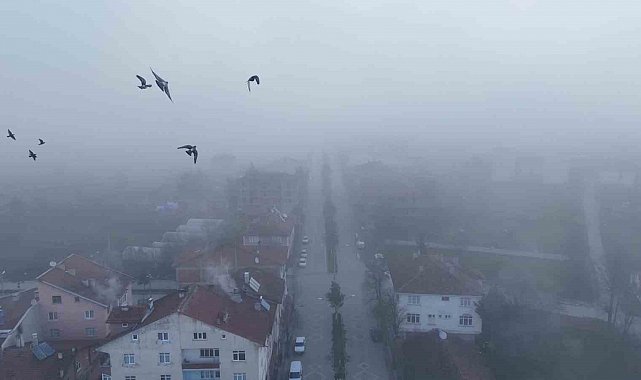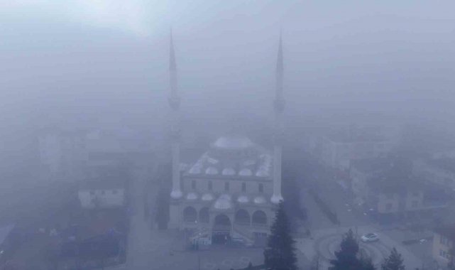 İlçe merkezini tamamen örten yoğun sis tabakası havadan görüntülendi.