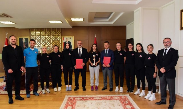 Ziyarette Kastamonu Üniversitesi Kadın Ragbi Takımı, Rektör Topal'a şampiyonluk kupasını takdim etti.