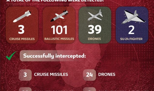 Katar Savunma Bakanlığı, 2 balistik füzenin daha engellendiğini duyurdu. Şimdiye dek 3 seyir füzesi, 98 balistik füze, 24 İHA ve 2 Su-24 savaş uçağının etkisiz hale getirildiği açıklandı.