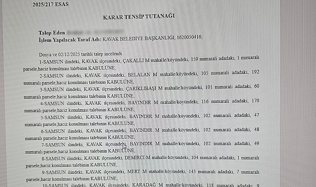 Mahkeme, 02 Aralık 2025 tarihli talep doğrultusunda Kavak'ın Çakallı, Belalan, Çarıkbaşı, Bayındır, Demirci, Mert ve Karadağ mahallelerinde bulunan ada ve parsel numaraları belirtilen gayrimenkullere haciz konulmasını kabul etti. Kararda, toplam 10 taşınmaz hakkında haciz talebinin yerinde bulunduğu ifade edildi.