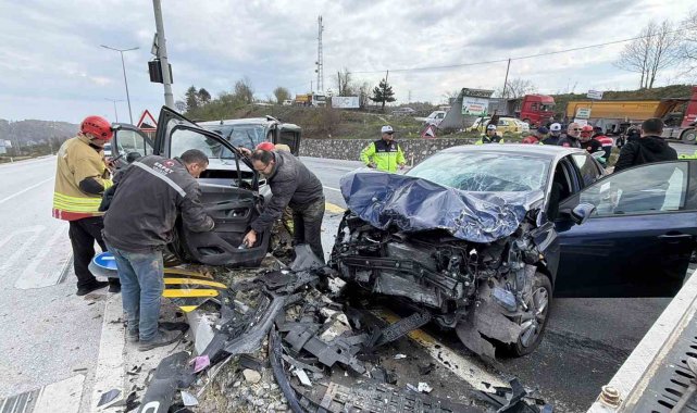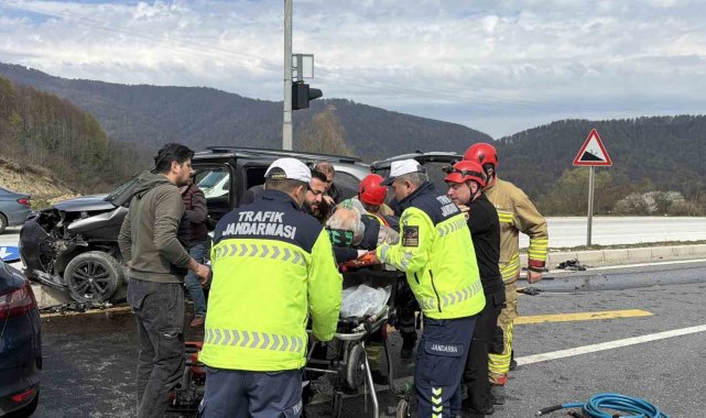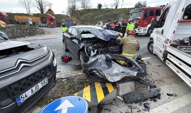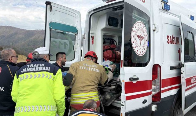 Düzce'de kavşakta meydana gelen kazada otomobil ile hafif ticari araç çarpıştı. Araçlarda sıkışan yaralı sürücüler itfaiyenin çalışmasıyla kurtarılırken, ulaşım bir süre tek şeritten sağlandı.