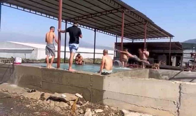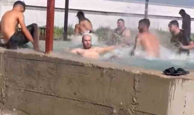Hatay'da sıcak havanın 45 derecenin üzerine çıkmasıyla bunalan tarım işçileri, maydanoz havuzunda serinledi.