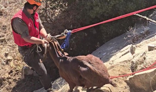 Kaya oyuğuna düşen ve 3 gün mahsur kalan keçi, film gibi operasyonla kurtarıldı