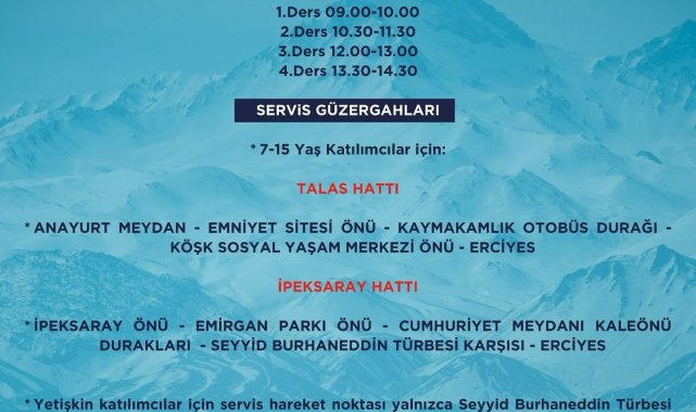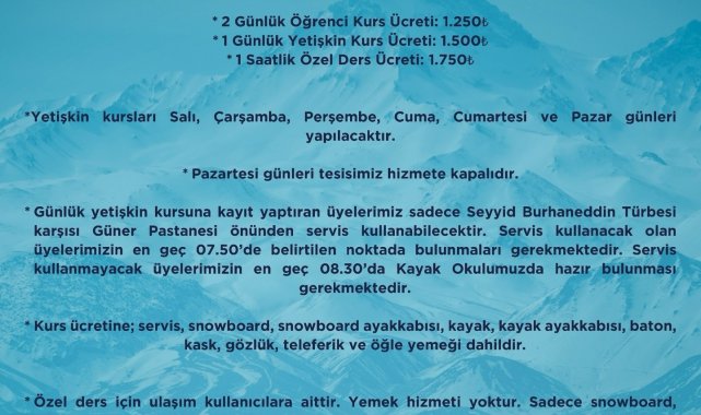 2024 Avrupa Spor Şehri Kayseri'de sporseverlerin gözdelerinden biri olan Kayak Okulu, dolu dolu bir sömestir dönemini geride bırakmaya hazırlanırken yeni dönem kayıtlarını da başlattı. Kayseri'de Büyükşehir Belediyesi, kış turizminin yanı sıra kentte kayak sporunun gelişimini hedefleyen Kayak Okulu ile düzenlediği kayak ve snowboard kurslarını hız kesmeden sürdürüyor. Spor A.Ş. tarafından hizmet verilen Kayak Okulu'nda, 8-9 Şubat 2025 7-15 yaş çocuk kursu, 4-9 Şubat 2025 tarihlerinde ise 16 yaş ve üzeri yetişkinler için hem kayak hem de snowboard kursu için müracaatlar başladı. Spor A.Ş. Kayak Okulu'nda yetişkin kursları Salı, Çarşamba, Perşembe, Cuma, Cumartesi ve Pazar günleri şeklinde planlanırken 2 günlük öğrenci kurs ücreti 1.250 TL, 1 günlük yetişkin kurs ücreti 1.500 TL, 1 saatlik özel ders ücreti ise 1.750 TL olarak belirlendi. Günlük kayak kursuna kayıt yaptıran üyeler sadece Seyyid Burhaneddin Türbesi karşısı Güner Pastanesi önünden servis kullanabilecek ve servis kullanacak olan üyeler en geç saat 07.00'de belirlenen noktada bulunarak servisle Erciyes'e ulaşacak. Servis kullanmayacak üyeler ise en geç saat 08.30'da Kayak Okulu'nda hazır bulunacak. Yeni dönem kursları, kurs ücretine; servis, snowboard, snowboard ayakkabısı, kayak, kayak ayakkabısı, baston, kask, gözlük, teleferik ve öğle yemeği dâhil olarak kayak severlere sunuldu. Öte yandan 7-15 yaş arası katılımcılar için servis güzergâhları ise Talas hattı: Anayurt meydan - Emniyet Sitesi önü - Kaymakamlık otobüs durağı - Köşk Sosyal Yaşam Merkezi önü, İpeksaray hattı: İpek Saray önü - Emirgan Parkı önü - Cumhuriyet Meydanı kale önü otobüs durağı - Seyyid Burhaneddin Türbesi karşısı olarak belirlenirken, yetişkin kursları için servis hareket noktası Seyyid Burhaneddin Türbesi karşısı olarak belirlendi.