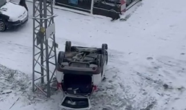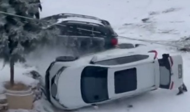 Malatya'da kar yağışı ve buzlanma nedeniyle kayan aracın park halindeki aracı devirdiği kaza cep telefonu kameralarına yansıdı.