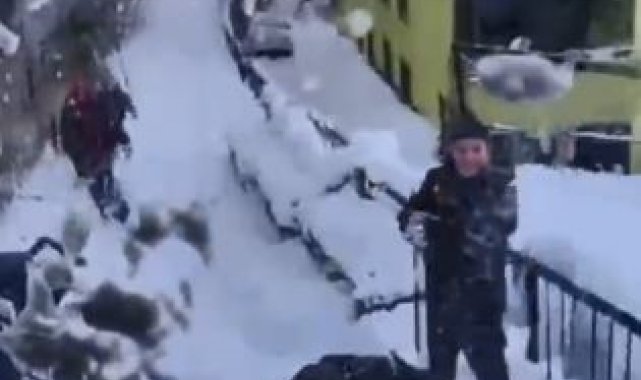 Artvin'de etkili olan yoğun kar yağışının ardından okullar bir gün süreyle tatil olurken, çocuklar da bunun sevincini kar topu oynayarak ve karda kayarak yaşıyor. Mahallede kayarak oyun oynayan minikler, kaydıkları alanı temizlemeye gelen iş makinesini görünce duruma tepki gösterirken, oyun alanlarının bozulmasını istemediler. Çocuklar, temizlik yapan Artvin Belediyesi'ne ait iş makinesine kartoplarıyla karşılık vererek adeta "kar toplu savunma" yaptılar.