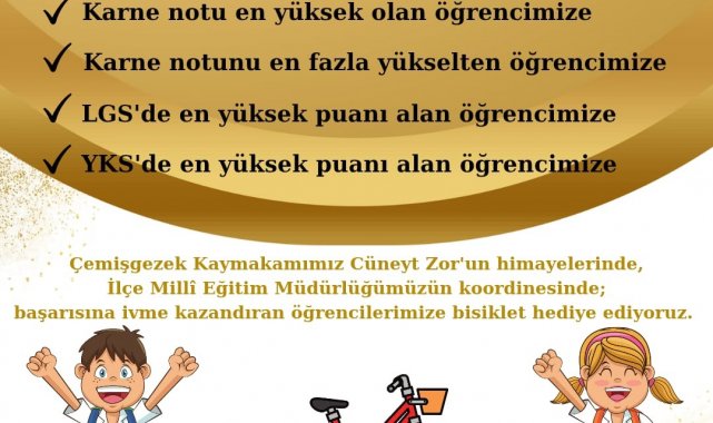 Çemişgezek Kaymakamlığının himayesi ve İlçe Milli Eğitim Müdürlüğü koordinasyonunda, başarısına ivme kazandıran öğrencilere hem yüz yüze hem de sosyal medya yoluyla bisiklet hediye edileceği duyuruldu. Çemişgezek Kaymakamı Cüneyt Zor'un sosyal medya hesaplarında da 'Her başarı bir ödülü hak eder' mottosuyla paylaştığı kampanya, çocuklarda anlamlı bir yarışa vesile oldu. Kampanya çerçevesinde, karne notu en yüksek olan öğrencilere, karne notunu en fazla yükselten öğrencilere, LGS'de en yüksek puanı alan öğrencilere ve YKS'de en yüksek puanı alan öğrenciler olmak üzere başarısını yükselten öğrenciler, Çemişgezek Kaymakamlığı tarafından bisikletle ödüllendirileceği belirtildi. Bununla birlikte öğrenciler kıyasıya yarışa girdi.