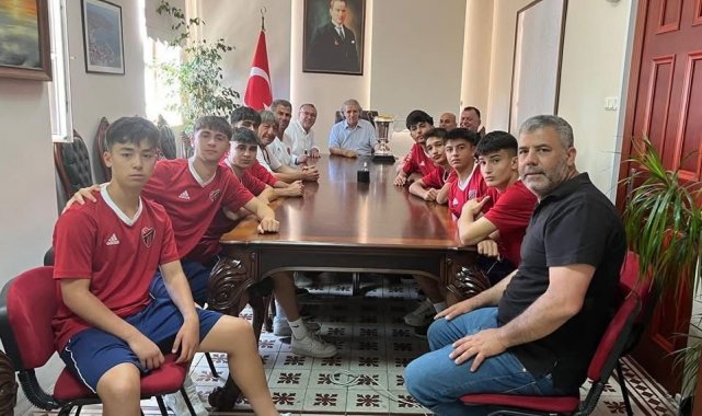 U16 Türkiye Şampiyonası'nda büyük bir başarıya imza atarak şampiyon olan Kuşadası Küçükada Spor Kulübü oyuncuları, antrenörleri ve yöneticileri, İlçe Gençlik ve Spor Müdürü ile birlikte Kuşadası Kaymakamı İbrahim Keklik'i makamında ziyaret etti.