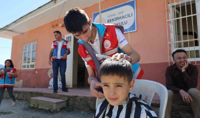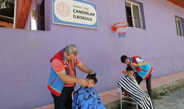 Adana'nın Feke ilçesi kırsalında çocuklar berbere gidemediği için Kaymakam Şafak Karaca, çocukların ayağına berberi götürüp tıraş ettirdi