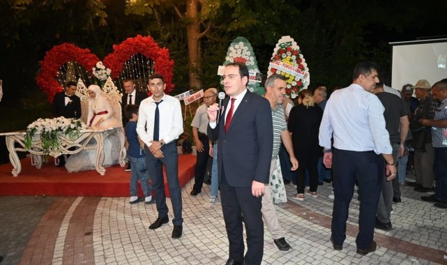 Kaymakam Türker, kız ve erkek tarafın ailesini, gelini ve damadı tebrik ederek düğün töreninin hayırlı ve uğurlu olmasını temenni ederek, "Damat benim çalışma arkadaşım, kendisi bizleri düğününe davet etti, biz de geldik, arkadaşımın ve eşinin, ailelerin bu mutlu günlerinde yanlarında olduk. Neşelerinin ve mutluluklarının daim olmasını ve paylaşılarak artmasını diliyorum. Gençlere huzur ve saadet temenni ediyorum. Sevgiyi, saygıyı ve sabrı da naçizane tavsiye ederim. Aileler adına misafirlere davete icabet ettikleri için teşekkür ederim" dedi.