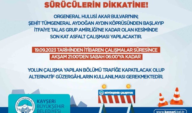 Kayseri Büyükşehir Belediyesi, kentin ulaşım ağındaki önemli arterlerde yol konforunu arttıramaya yönelik çalışmalar çerçevesinde Orgeneral Hulusi Akar Bulvarı'nın Şehit Tümgeneral Aydoğan Aydın Köprüsü'nden başlayıp İtfaiye Talas Grup Amirliği'ne kadar olan kesiminde son kat asfalt çalışmasına yarın 21.00'da başlayacak.