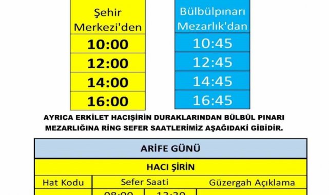 Öte yandan, Ramazan Bayramı boyunca tramvay hatlarında ulaşım ücretsiz olacak. Tramvay hatları için ücretsiz ulaşım uygulaması Ramazan Bayramı'nın ilk günü olan 20 Mart Cuma günü başlayıp, bayramın son günü olan 22 Mart Pazar günü saat 23.59'da sona erecek. Ayrıca Ulaşım A.Ş. Arife günü mezarlık ziyaretlerini kolaylaştırmak için Asri Mezarlık ve Bülbülpınarı Mezarlığı'na ücretsiz otobüs seferleri düzenliyor.