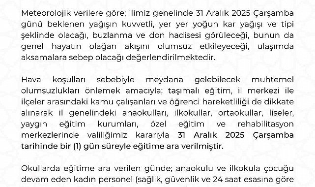 "Hava koşulları sebebiyle meydana gelebilecek muhtemel olumsuzlukları önlemek amacıyla, taşımalı eğitim, il merkezi ile ilçeler arasındaki kamu çalışanları ve öğrenci hareketliliği de dikkate alınarak, il genelindeki anaokulları, ilkokullar, ortaokullar, liseler, yaygın eğitim kurumları, özel eğitim ve rehabilitasyon merkezlerinde valiliğimiz kararıyla 31 Aralık 2025 Çarşamba tarihinde bir gün süreyle eğitime ara verilmiştir" denildi.