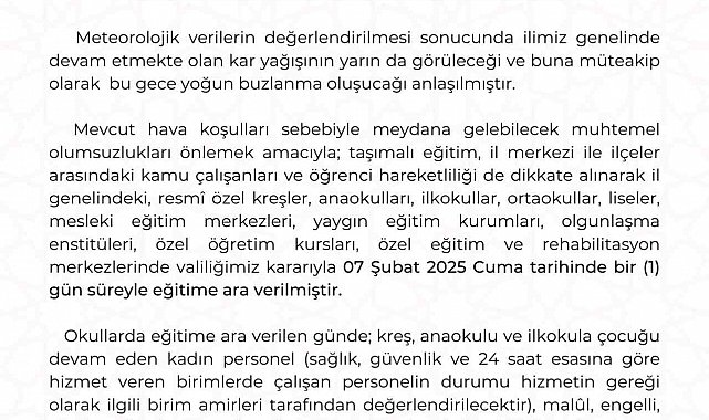 Kayseri Valiliği'nden yapılan açıklamada, "Meteorolojik verilerin değerlendirilmesi sonucunda ilimiz genelinde devam etmekte olan kar yağışının yarın da görüleceği ve buna müteakip olarak bu gece yoğun buzlanma oluşucağı anlaşılmıştır. Mevcut hava şartları sebebiyle meydana gelebilecek muhtemel olumsuzlukları önlemek amacıyla; taşımalı eğitim, il merkezi ile ilçeler arasındaki kamu çalışanları ve öğrenci hareketliliği de dikkate alınarak il genelindegenelindeki resmî özel kreşler, anaokulları, ilkokullar, ortaokullar, liseler, mesleki eğitim merkezleri, yaygın eğitim kurumları, olgunlaşma enstitüleri, özel öğretim kursları, özel eğitim ve rehabilitasyon merkezlerinde valiliğimiz kararıyla 7 Şubat 2025 Cuma tarihinde 1 gün süreyle eğitime ara verilmiştir. Okullarda eğitime ara verilen günde; kreş, anaokulu ve ilkokula çocuğu devam eden kadın personel (sağlık, güvenlik ve 24 saat esasına göre hizmet veren birimlerde çalışan personelin durumu hizmetin gereği olarak ilgili birim amirleri tarafından değerlendirilecektir), malul, engelli, ağır kronik rahatsız ve hamile kamu çalışanları da idari izinli sayılacaktır" ifadelerine yer verildi.