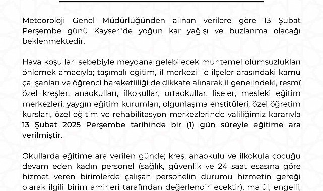 Kayseri Valiliği'nden yapılan açıklamada, "Meteoroloji Genel Müdürlüğünden alınan verilere göre 13 Şubat Perşembe günü Kayseri'de yoğun kar yağışı ve buzlanma olacağı beklenmektedir. Hava şartlarısebebiyle meydana gelebilecek muhtemel olumsuzlukları önlemek amacıyla; taşımalı eğitim, il merkezi ile ilçeler arasındaki kamu çalışanları ve öğrenci hareketliliği de dikkate alınarak il genelindeki, resmî özel kreşler, anaokulları, ilkokullar, ortaokullar, liseler, mesleki eğitim merkezleri, yaygın eğitim kurumları, olgunlaşma enstitüleri, özel öğretim kursları, özel eğitim ve rehabilitasyon merkezlerinde valiliğimiz kararıyla 13 Şubat 2025 Perşembe tarihinde 1 gün süreyle eğitime ara verilmiştir. Okullarda eğitime ara verilen günde; kreş, anaokulu ve ilkokula çocuğu devam eden kadın personel (sağlık, güvenlik ve 24 saat esasına göre hizmet veren birimlerde çalışan personelin durumu hizmetin gereği olarak ilgili birim amirleri tarafından değerlendirilecektir), malul, engelli, ağır kronik rahatsız ve hamile kamu çalışanları da idari izinli sayılacaktır. Kamuoyuna saygıyla duyurulur" ifadelerine yer verildi.