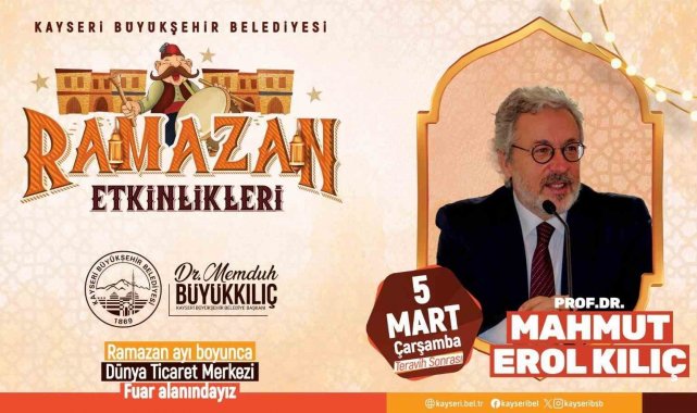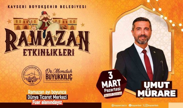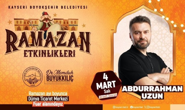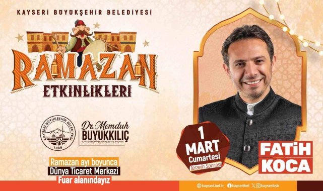 Gönül belediyeciliğini ilke edinerek çalışmalarını çeşitlendiren ve arttıran Büyükşehir Belediye Başkanı Dr. Memduh Büyükkılıç, Büyükşehir Belediyesi'nin Ramazan'daki etkinliklerine tüm Kayserilileri davet etti. Her güne bir etkinlik sığdıran büyükşehir belediyesi, Ramazan ayının ruhuna uygun bir şekilde huzur ve mutlulukla geçmesine imkân tanıyacak. Bu doğrultuda birbirinden ünlü ve sevilen konukları ağırlayacak olan Ramazan Etkinlikleri, Dünya Ticaret Merkezi Fuar Alanı'nda vatandaşlara kapılarını açacak. 1 Mart 2025 Cumartesi günü saat 15.00'te açılışı gerçekleştirilecek olan Ramazan Etkinlikleri'ne ilk gün sevilen sanatçı akademisyen Fatih Koca ilahileri ile renk katacak. Ramazan ruhunu en iyi şekilde yaşatmanın yanı sıra sosyal ve kültürel faaliyetler ile de vatandaşların sosyalleşmesi hedeflenen etkinliklerde, iftar sonrası çocuk programları, teravih namazı sonrası ise Ramazan etkinlikleri yapılacak. Çocuk programları kapsamında, aşık-maşuk, hacivat-karagöz, çocuk tiyatroları, yarışmalar, yüz boyama etkinliği, maskotlu çocuk oyunları düzenlenecek.