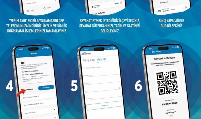"Uygulama mağazalarından "Yerim Ayrı" mobil uygulamasını cep telefonunuza indiriniz. Üyelik ve kimlik doğrulama işlemlerini tamamlayınız. Seyahat etmek istediğiniz ilçeyi seçiniz. İlçe seçiminden sonra güzergâh, tarih ve saat bilgilerini belirleyiniz. Alt kısımda listelenen seferler arasından size uygun olanı seçiniz. Biniş yapacağınız durağı belirleyiniz. "Bilet al" ekranında kendiniz ya da bir yakınınız için bilet alabilirsiniz. Ödeme işlemleri için bir defaya mahsus Bankalar Arası Kart Merkezi'ne (BKM Express) kayıt olunuz ve kart bilgilerinizi tanımlayarak ödemeyi tamamlayınız. Satın alma işleminiz tamamlandığında oluşan QR kodu, araca biniş sırasında şoför uygulamasına okutarak yolculuğunuza başlayabilirsiniz."