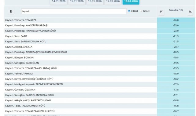 Şehirde son günlerde etkili olan soğuk hava hayatı olumsuz etkilemeye devam ediyor. Sabah saatlerinde vatandaşlar araçlarını çalıştırmakta güçlük çekerken, Meteoroloji 7. Bölge Müdürlüğü de olması muhtemel don olayına karşı vatandaşlara uyarılarda bulundu. Meteoroloji'den alınan bilgilere göre Kayseri'nin en soğuk yeri - 26,8 derece ile Tomarza ilçesi oldu. Şehirdeki bazı bölgelerde ölçülen değerler şu şekilde;